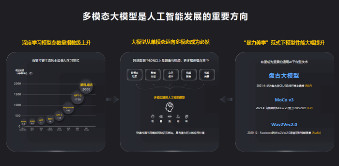 首先,性能业界领先的中文预训练模型、语音预训练模型、视觉预训练模型是我们三模态模型的基础。比如,视觉的预训练模型,首次实现超越有监督学习的性能,速度比其他的方法提高8倍,在语义分割的结果上,也超越了有监督学习的水平。在中文预训练模型里面提出来任务感知和推理增强的模型,性能相比比GPT-3明显提升。语音预训练模型,针对语音领域语种多样、标注成本高的问题,实现了基于语音预训练的多语言、多任务、低资源关键技术的突破,使我们用很少的有标注数据就可以实现语音识别的性能大幅度提升。