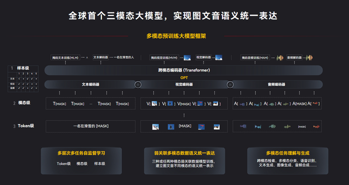 我们首次将语音信息引入,并通过一个统一语义空间网络表达生成三模态模型,可以把刚才提到的“认知冰山”或“暗物质”的庞大语义空间学习出来,能更加接近人类真正的感情和思考。特别地,由于侧重交互功能的语音的加入,使我们的大模型一下子变“活”了,使人工智能迈向更高层次的通用型人工智能方向发展。