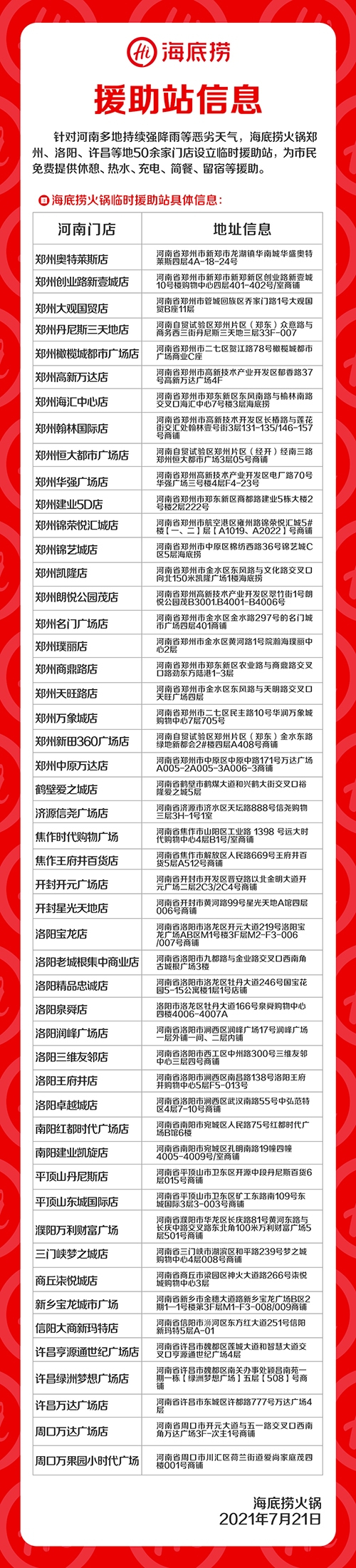 7月22日,记者从海底捞方面获悉,海底捞郑州、洛阳、许昌、安阳、南阳、焦作等50多家门店将免费向市民开放,设立临时援助站,并根据门店实际情况提供休憩、热水、充电、简餐、留宿等服务。