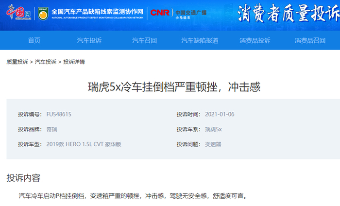 更多数据显示,奇瑞投诉中关于发动机和变速箱的投诉数为9个,占总投诉量比值为36%。其中,有两位瑞虎5x的车主向中国网记者投诉称,其车辆挂入倒挡后,有4-5秒延迟,且伴有严重的顿挫感和冲击感。有一位车主描述称:“4S店跑过两次了,换了行车电脑,但最后还是解决不了问题。车从买回来2个月到现在一直出现这情况。这个CVT变速箱真是不敢恭维。”