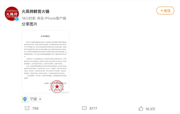日前,据钱江晚报报道称,有微博爆料在调查郑恺投资的连锁火锅店火凤祥时,发现其售卖变质食材、生菜回收重复使用、卤汤发酸,让人大跌眼镜。8月14日深夜,郑恺的连锁火锅店@火凤祥鲜货火锅 发布公开致歉信,就此致歉。