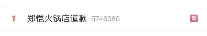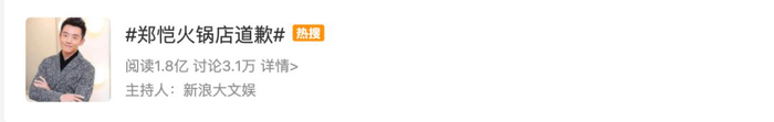 之后,#郑恺火锅店道歉#冲上微博热搜榜第一名。截至发稿,微博相关话题阅读量达到1.8亿。