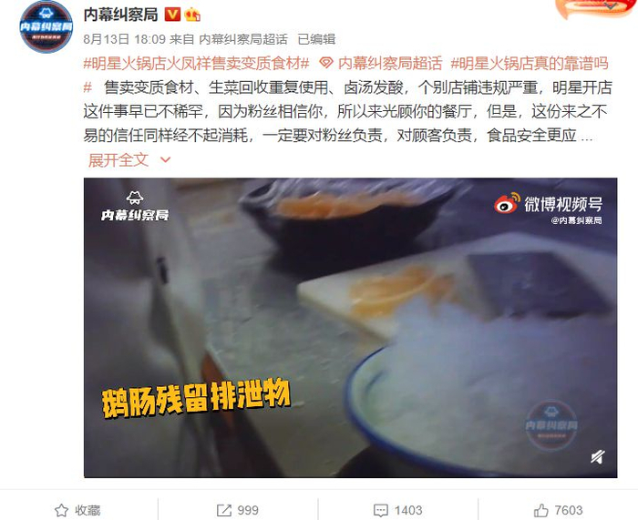 对此,8月14日晚,郑恺投资的连锁火锅店,在官方微博发出公开致歉信,回应被指卖变质食材的质疑,致歉信内容如下: