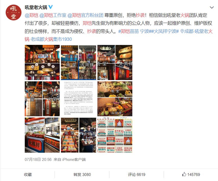 据红星新闻此前报道,据吼堂老火锅发文指出,火凤祥店面大到整体环境、复古装修风格,小到地板花纹,天花吊牌文字、餐具细节都与吼堂老火锅一样,从服务创意到档口设置都如出一辙,就连物料设计也使用相同风格字体,成了吼堂老火锅的“翻版”,甚至连品牌的对外宣传手册,也使用吼堂老火锅的店内实景照片。