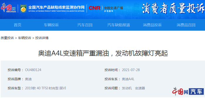 原标题:一汽-大众奥迪A4L新车两年变速箱发动机接连出故障 车主大呼:折腾不起 来源:中国网