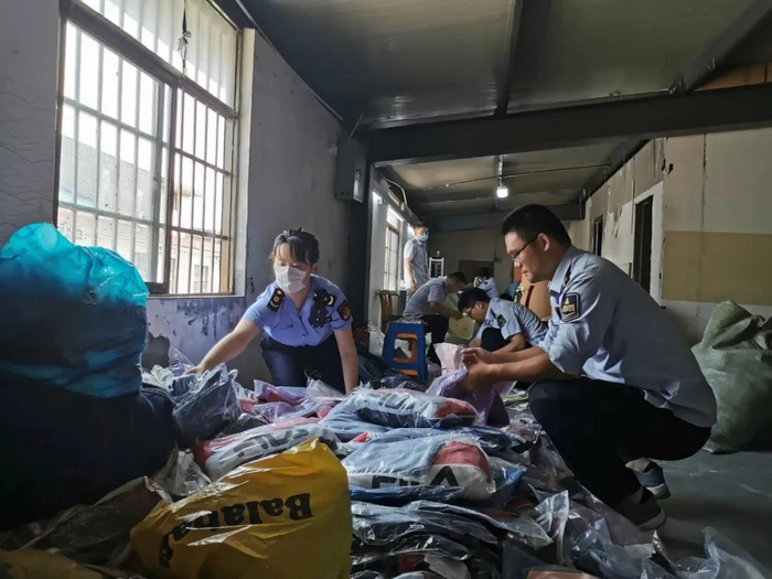 近日,上海市市场监管局执法总队接举报线索,反映某线上经营公司销售的大量服装涉嫌侵犯了他人的注册商标专用权。总队主动跨前一步,启动联合办案机制,与上海市公安局经侦总队和宝山区市场监管局成立联合办案小组,排摸线上和线下实际情况,制定检查计划和方案。同时,联系相关注册商标权利人,配合进行商标真伪鉴定。执法人员现场检查发现,该公司仓库内存放有标注“NIKE”“CHAMPION”等7个商标的服装多达49款,共计8440件。