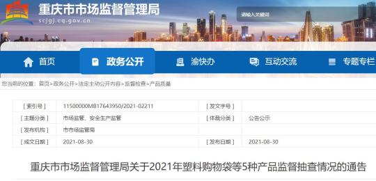 中国经济网北京9月2日讯 (记者 马先震 孙辰炜) 重庆市市场监督管理局网站近日公布《关于2021年塑料购物袋等5种产品监督抽查情况的通告》,按照《中华人民共和国产品质量法》等法律法规的相关规定,将2021年塑料购物袋、洗衣粉(含洗衣膏)、成品油、化肥、儿童及婴幼儿服装等5种产品监督抽查情况通告。