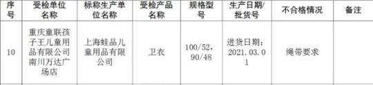 重庆童联孩子王儿童用品有限公司南川万达广场店销售、上海蛙品儿童用品有限公司生产的卫衣绳带要求不合格。规格型号为100/52、90/48,进货日期2021年3月1日。