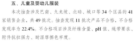 其中,本次抽查儿童及婴幼儿服装涉及巴南、九龙坡、北碚、城口等34个区县的41家销售企业,共49批次。抽查发现11批次产品不合格,不合格发现率为22.4%。不合格项目涉及纤维含量、pH值、绳带要求、附件抗拉强力、耐湿摩擦色牢度。