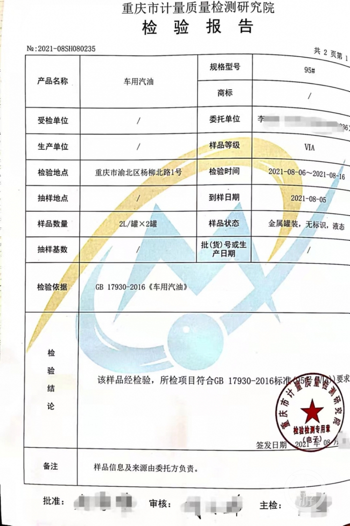 事发当天,李先生在丰都安宁加油站加油后不久,车辆出现动力不足、EPC故障灯亮等情形。李先生怀疑故障与加油站油品质量有关,随后将油品样本送到重庆市计量质量检测研究院进行检验。9月6日,刚刚出差回渝的李先生,向记者发来由市计量质量检测研究院针对送检样本出具的检验报告。