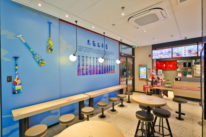 东江之星肯德基以龙舟主题打造了首个“非遗空间”。在东莞,龙舟是文化历史悠久的民俗运动,代表着奋发向上,力争上游的拼搏精神,也是东莞的城市名片,“赛龙舟”更是获选成为国家级非物质文化遗产。东江之星店空间的设计以简约为主,手绘3D风格呈现也更贴近年青群体。龙舟上整齐划一的船桨,也化身涂鸦装饰,与餐厅的风格非常融合。13个色彩各异的船桨,代表着每年为期一个月的“龙舟月”,参与活动的13个镇街。精美的中堂龙舟模型,吸引了孩子和家长们驻足,一边享受美食,一边欣赏非遗文化。(中新经纬APP)