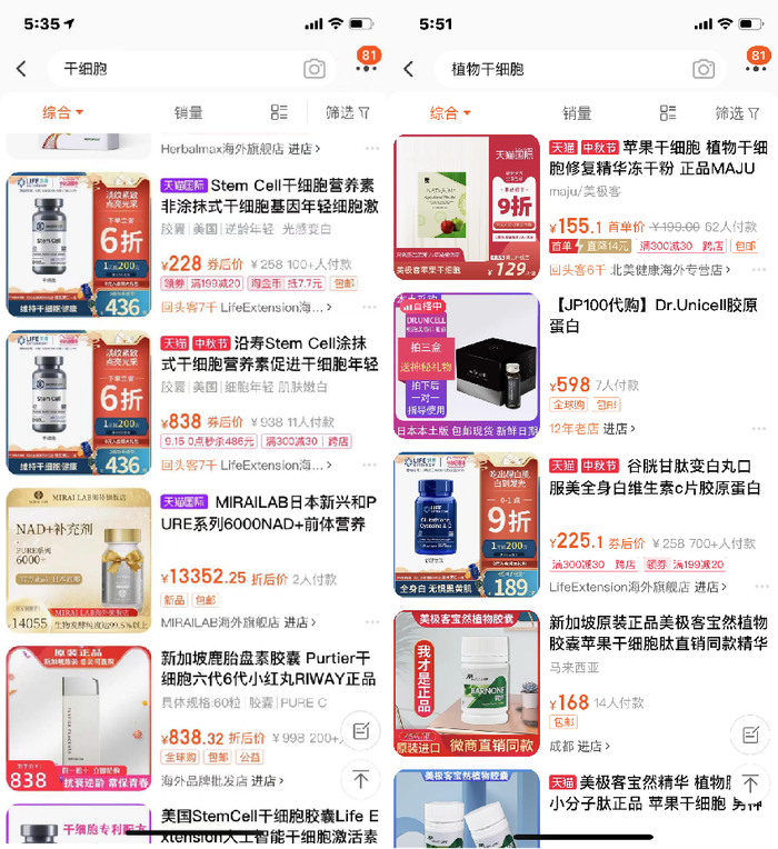9月14日,环球健康记者在某电商平台上搜索“干细胞”、“植物干细胞”,搜索结果发现标签带有“干细胞”的产品不在少数,包括口服胶囊、注射用填充剂、涂抹用产品等,这些产品的主打功能为“逆龄抗衰”“长寿”等。