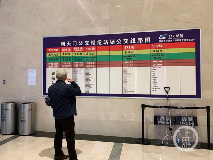10月17日,上游新闻记者来到朝天门公交枢纽站场看到,5号门左右两边,正是刘先生提及的公交线路图,图上的181线路站点包括大庆村安褔福特4S店站与首创鸿恩站。
