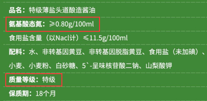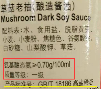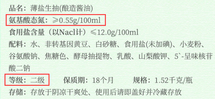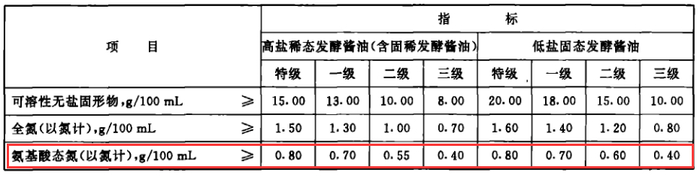 GB/T18186-2000《酿造酱油》,不同等级酱油的氨基酸态氮含量不同:
