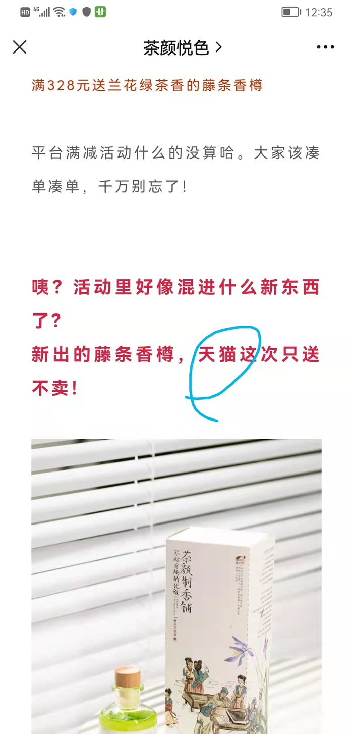消费者小李是一名女大学生。10月31日,茶颜悦色官方微信公众号推送了一条名叫“向三顿半老师学习!双十一买15件送十五件”的双十一活动推文。在推文里,有一段红字介绍营销活动——“满328元送兰花绿茶香的藤条香樽”,推文还强调“新出的藤条香樽,这次只送不卖”。随后,推文详细介绍了该香樽的使用体验。