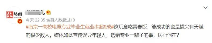 与#南京某高校电竞专业就业率超9成#一起进入微博热搜的,还有另一条新闻#近半电竞从业者收入低于当地平均薪资#。