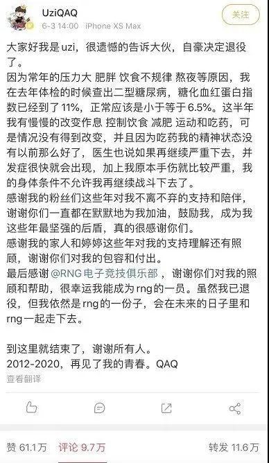 Uzi在微博中表示,“因为常年的压力大、肥胖、饮食不规律、熬夜等原因,我在去年体检的时候查出二型糖尿病,糖化血红蛋白指数已经到了11%,正常应该是小于等于6.5%。这半年我有慢慢的改变作息、控制饮食、减肥、运动和吃药,可是情况没有得到改变,并且因为吃药我的精神状态没有以前那么好了,医生也说如果再继续严重下去,并发症很快就会出现,加上我原本手伤就比较严重,我的身体条件不允许我再继续战斗下去了。 ”