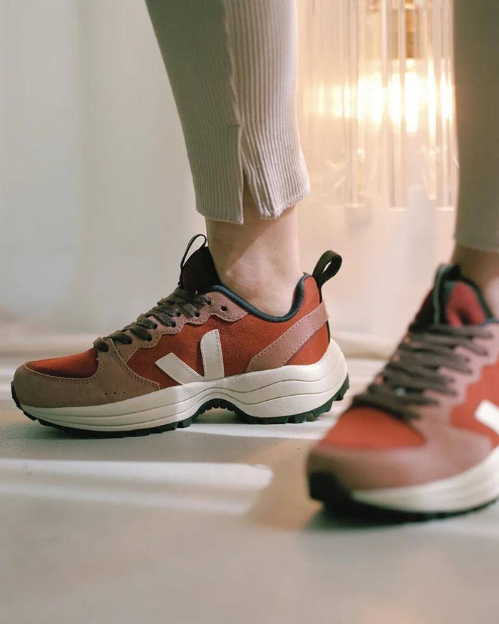 而这款亮橘色的logo就很耀眼,一下就能从路人中成为C位。Veja甚至将亮色设计在鞋后方的鞋沿上,看起来就更有趣了。