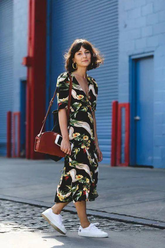 周也则将碎花连衣裙与小白鞋一起穿,再加上她一头黑色长发,看上去青春无敌。