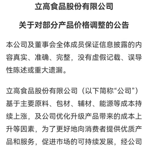 1月5日晚间,“烘培食品第一股”立高食品宣布,将对部分主要的冷冻烘焙食品及烘焙原材料的产品出厂价格进行调整,上调幅度为3%-8%不等,调整后价格自2022年1月4日起按各产品调价通知执行。