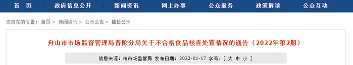 中国质量新闻网讯 近日,浙江省舟山市市场监督管理局普陀分局发布关于不合格食品核查处置情况的通告(2022年第2期),涉及抽样单编号为SC21330000301134738(餐盘)、SC21330000301134739(碗)。