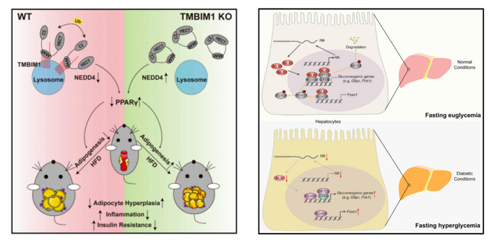 肥胖、2型糖尿病以及NAFLD是代谢综合征的主要诱因,为了更好地解决这些健康威胁,李红良教授团队对疾病发病机制进行了深入探索。采用大规模系统生物学筛选分析、免疫荧光、过表达腺病毒处理等先进技术,研究团队发现TMBIM1是通过降低PPARγ的稳定性而抑制脂肪生成,是一种有效抑制脂肪生成的全新因子,为加深脂肪生成调控机制的认识提供了潜在分子靶点与新思路;发现Nemo样激酶(NLK)作为一种新型肝糖异生负调控因子,促进CRTC2和FOXO1核输出,在糖异生调节网络中起着关键作用,NLK可能成为2型糖尿病的潜在治疗靶点;为了进一步阐明NAFLD的发病机制,团队还发现了一系列重要分子,如MAVS、SNX8、RNF5、RGS5等,它们都是NAFLD发展的关键分子,是NAFLD预防和治疗的潜在药物靶点。系列研究成果发表在Cell Metabolism、Hepatology等国际权威杂志。