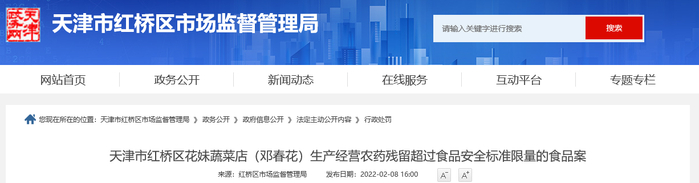 中国质量新闻网讯 近日,天津市红桥区市场监督管理局网站公开关于天津市红桥区花妹蔬菜店(邓春花)的行政处罚信息。