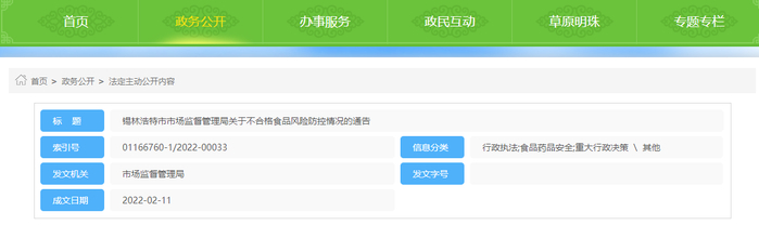 内蒙古锡林浩特市市场监督管理局公布锡林浩特市牧淳酸马奶店不合格食品风险防控情况