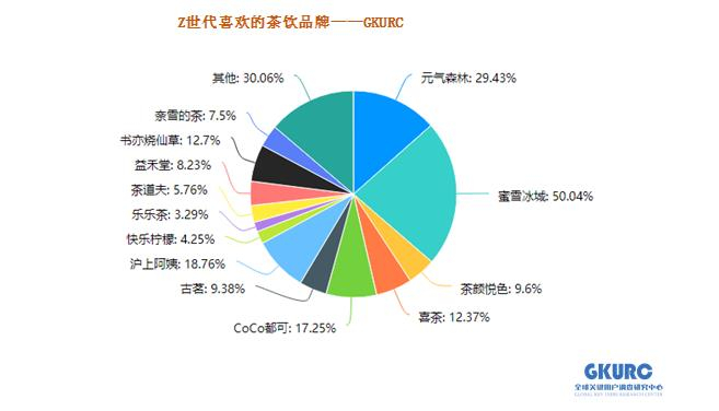 根据千趣GKURC调查结果(该项调查是多项选择),受访的Z世代购买茶饮的品牌偏好是:蜜雪冰城(50.04%)排在首位,元气森林(29.43%)和沪上阿姨(18.76%)分列2、3位。位列4~10位的分别是:CoCo(17.25%)、书亦烧仙草(12.7%)、喜茶(12.37%)、茶颜悦色(9.6%)、益禾堂(8.23%)、奈雪的茶(7.5%)、茶道夫(5.76%)。