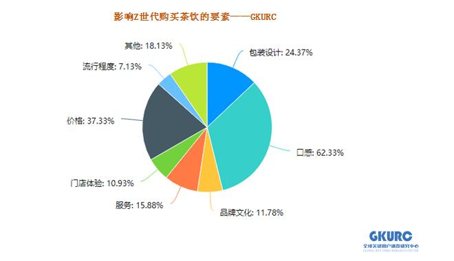 影响Z世代购买茶饮要素(该项调查是多项选择)排在首位的是口感(62.33%),排在2-7位的分别是:价格(37.33%)、包装设计(24.37%)、服务(15.88%)、品牌文化(11.78%)、门店体验(10.93%)、流行程度(7.13%)。