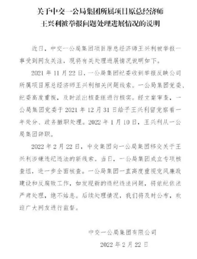 此前,有女子“微博账号wan婉婉_”实名举报王兴利生活腐化堕落,收受贿赂、大搞权色交易,引发关注。2月22日晚,中交一公局集团发布关于此事的情况说明,称已于2021年12月31日给予王兴利留党察看一年、政务撤职处理。并表示2022年1月10日,王兴利从一公局集团辞职。