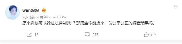 对于王兴利的回应,“wan婉婉_”在个人微博回应称:原来卖惨可以躲过法律制裁?那用生命能换来一份公平公正的调查结果吗?