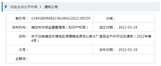 关于注销清远市清城区源潭镇金源龙山泉水厂食品生产许可证的通告(2022年第4号)