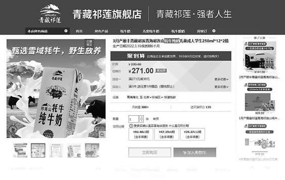 青藏祁莲旗舰店商品页面显示有“牦牛纯奶”字样。