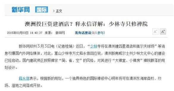 此次也并非少林寺首次涉足房地产。早在2015年,就有传闻指出少林寺在澳洲建四星酒店和高尔夫球场的消息。彼时,释永信向媒体回应称,“很多媒体朋友都在关心少林寺哪来这么多钱去搞高尔夫球场和度假酒店,其实,那些投资和规划从来都与少林寺无关,”释永信说,“少林寺的禅修空间、农禅空间、禅武空间必须由少林寺做主,如果企业家从中看到人流、需求和商业机会,大家愿来共建共享,只要澳洲政府和民众愿意,投资者愿意,我只会随缘说好。”