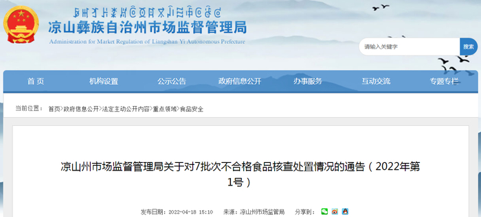 四川省凉山州市场监管局关于对7批次不合格食品核查处置情况的通告(2022年第1号)