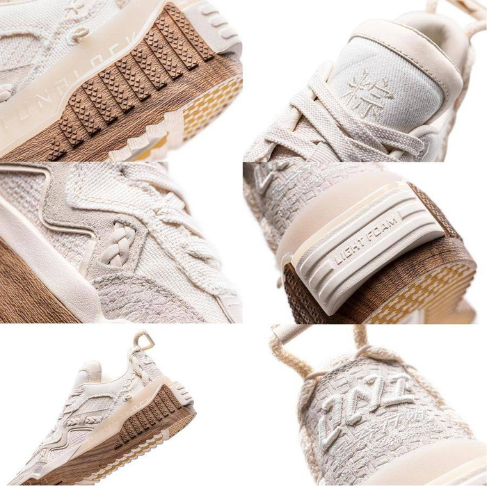 “粽”意满满的「001 Unblock端午限定版」,视觉与味觉被同时激活。有别于以往,此次「001 Unblock端午限定版」本体被包裹于一片鲜绿的“粽叶”之中,设计师通过印有粽叶纹理图案的绿色杜邦纸配以多条五彩绳鞋带交错绑缚,还原粽子外观。剥开粽衣后,糯米白色为主体的鞋款灵动出现,呈现潮流与传统相互交织的奇妙仪式感。简洁的鞋面并不简单,棉麻材料搭配民族感编织细节增加了鞋身立体辨识度。当视线进一步聚焦,更可发现诸多质感细节——鞋头与鞋后跟处宛如米粒形状的压花纹路,颗颗饱满。鞋后跟重工立体刺绣“001 传奇开始”指向鞋款001家族成员身份。木纹形态的橡胶大底代表着食粽主题下谷物成熟的姿态色彩。而附赠的五彩绳鞋带可进一步作为鞋身装点,DIY出更富个性的表达。藏在鞋舌内的粽子口味印花也是「001 Unblock端午限定版」的彩蛋设计,“好运八宝粽”、“水晶紫薯粽”、“蛋黄鲜肉粽”、“闽南烧肉粽”,四种代表南北食粽文化的图案随机呈现,盲盒体验、趣味十足。颜值之外,「001 Unblock端午限定版」采用全掌LIGHTFOAM中底泡棉与模块化的卡塑大底结合的设计,中底增加了270度环抱后跟的立体TPU,增强了鞋款的稳定性与支撑性,带来同样出“粽”的舒适穿着体验。