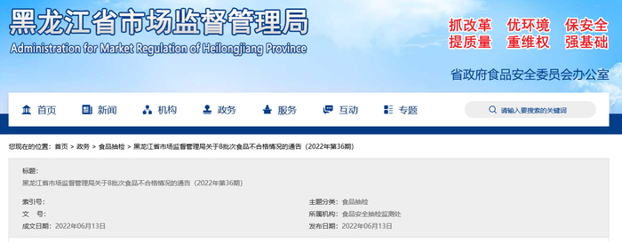 对抽检中发现的不合格食品,黑龙江省市场监督管理局已责成辖区市场监管部门立即组织开展核查处置工作,及时查清产品流向,采取下架、召回等风险控制措施,对违法违规行为依法查处,并将采取的风险防控措施和核查处置情况向社会公开。