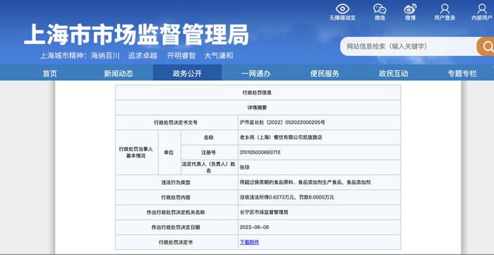 6月6日,上海市长宁区市场监督管理局发布的行政处罚决定(沪市监长处〔2022〕052022000205号)显示,2022年4月23日,执法人员到老乡鸡(上海)餐饮有限公司凯旋路店进行执法检查时发现,该门店涉嫌使用超过保质期的炼制鸡油加工、制作食品,并对外销售。