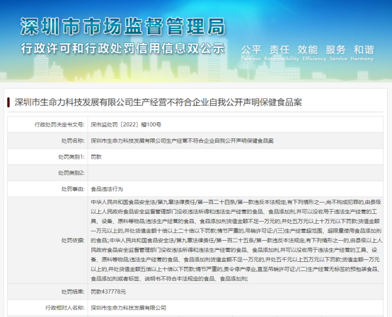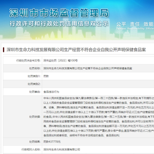 根据7月5日深圳市市场监督管理局发布的行政处罚决定(深市监处罚〔2022〕稽100号),深圳市生命力科技发展有限公司“生产经营不符合企业自我公开声明保健食品”构成食品违法行为,深圳市市场监督管理局依据《中华人民共和国食品安全法》相关规定,对该公司作出罚款437778元的行政处罚决定。