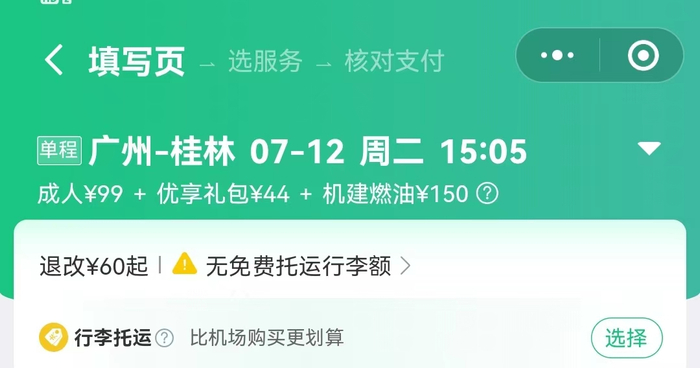 比如,7月12日广州到桂林,成人票价99元,机建燃油费则有150元。
