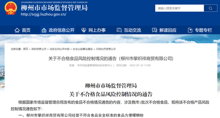 广西柳州市市场监督管理局公布1批次不合格方便螺蛳粉风险控制情况