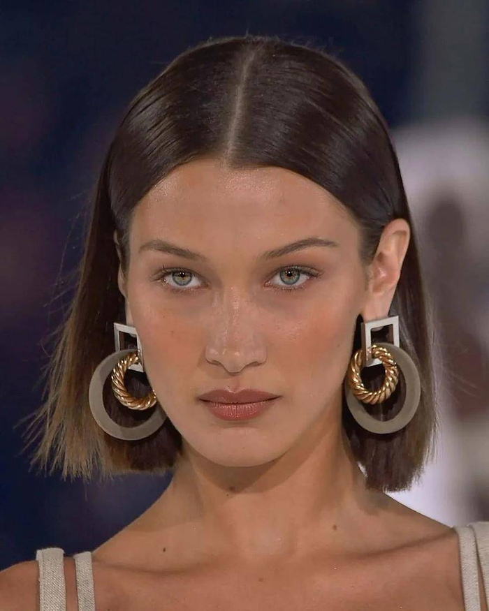 以Bella为例可以看到,短发状态下,过多的“收窄”只会令中庭显得更长,人会看着老气许多,让脸型得以完全露出反而时髦度大大增加。在这张2020 Jaquemus秀场造型里我们还可以学到,大体量的“钝感”耳饰也是平衡发型脸型的好单品。
