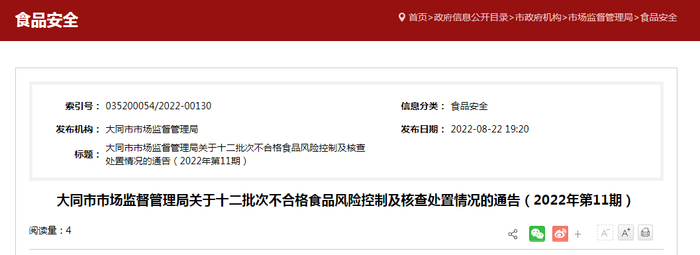 中国质量新闻网讯 8月22日,山西省大同市市场监督管理局发布关于十二批次不合格食品风险控制及核查处置情况的通告(2022年第11期),涉及山西永辉超市有限公司大同凯旋城分公司销售的紫甘蓝、小日圆。