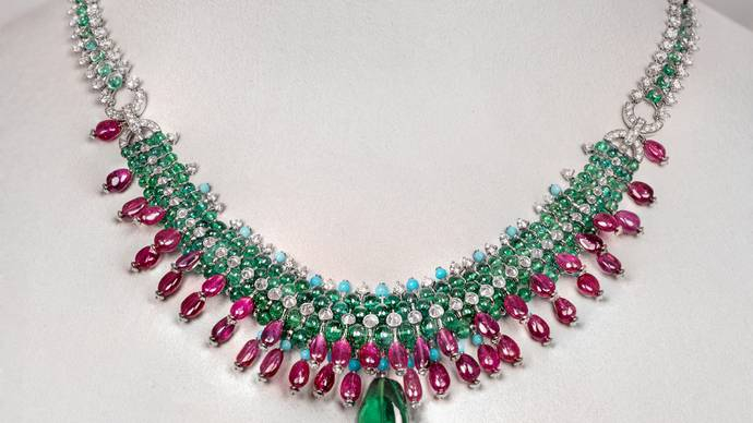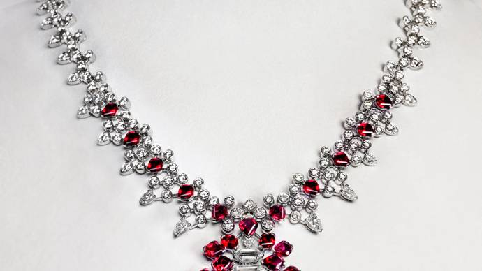 HEBILLA项链:构造的创想,形状各异又和谐有序,这件作品延续卡地亚混合多种造型的设计手法,完全基于宝石本身构建结构,利用宝石的不同形状,将一组28颗产自莫桑比克的风筝形红宝石与大量六边形、梨形、方形及明亮式切割钻石组合搭配。艳粉色和钻石的纯粹光芒营造鲜明对比,精心排列之余展现平衡的美感。