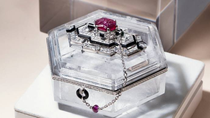 APHAIA胸针与珠宝盒:装饰艺术风格的典范之作,这件高级珠宝器物展现了卡地亚擅长的装饰艺术风格:颜色、几何造型和有序结构。这款优雅的珠宝盒上配有一枚可拆卸胸针,几何造型的白水晶与胸针上明亮的红宝石和凸圆形祖母绿形成鲜明对比。