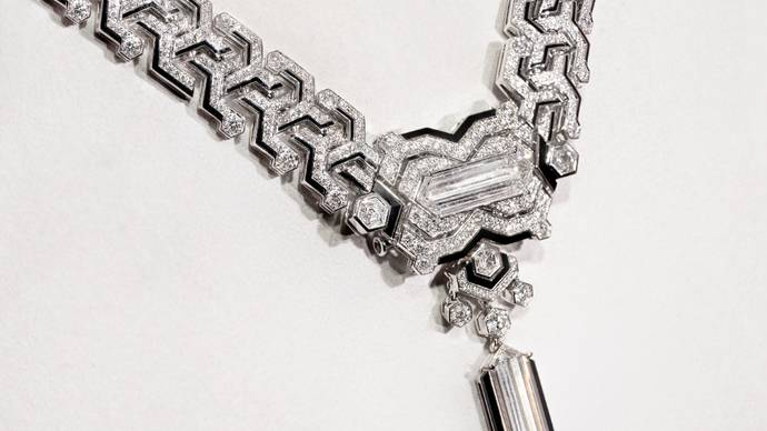 OKTOGON项链:星罗棋布的几何造型,两颗比例和谐优美的六边形钻石是整件作品的亮点和灵感源泉。从六边形钻石的形状出发,卡地亚采用近似门楣的设计,以不连续的线条勾勒出引人注目的图案,黑白对比色彩呼应装饰艺术时期的标志性配色。