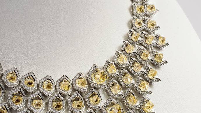 RYU项链:东方龙鳞的抽象表达,卡地亚选用独特八面体造型黄钻重构龙这种奇幻生物的鳞甲。这种八边形的几何形状极少用于珠宝创作中,彰显卡地亚对别具个性的宝石的钟爱之情。79颗黄钻镶嵌于铺钻六边形几何结构中央,构成盘错的几何网格。每个几何结构仅以下半部固定黄钻,结构间彼此相连,以精准的设计和工艺构筑新颖佳作。