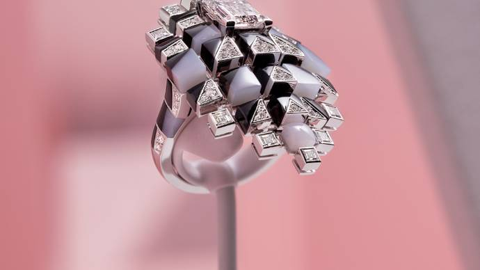 OPART戒指:幻视艺术的实践,OPART是“欧普艺术”(optical art)的缩写,又称光效应艺术。1颗2.02克拉钻石居于视觉核心,设计完全围绕这颗钻石进行,反复再现其长方形造型。每枚图案被镶嵌于不同高度,营造出近乎动态的视觉效果,缟玛瑙点缀其中,令整体更显醒目,逐渐变换的大小图案形成视觉动感,呈现如幻似真的景象。