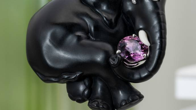 ELEPHANT NOIR胸针:雕刻憨态可掬的大象姿态,在木兰木化石和花生木化石上雕刻出一头令人过目难忘的大象,憨态可掬的形态彰显卡地亚宝石雕刻工艺(Glyptics)的高超技艺,亦向品牌的灵感源泉之一——印度致敬。